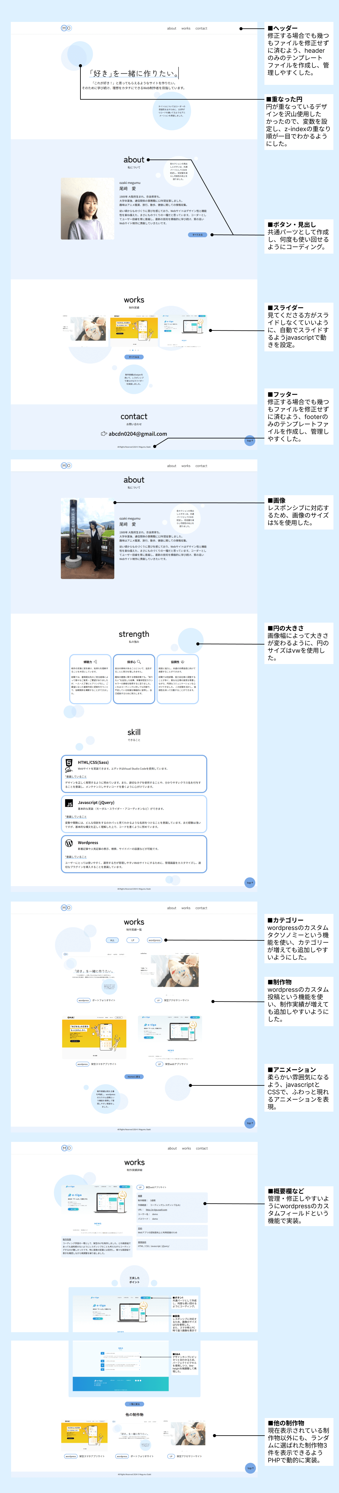 コーダーとして工夫したポイントを直接該当箇所に記載し、見ていただく方がサイト内をあちこち移動せずに済むような構成にしました。苦労した点はサイトのモチーフにしている円の大きさを画面幅によって変えることです。%を使用すると親要素に依存するので、vwを使用することによって対応しました。